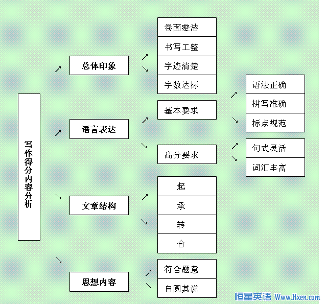 研究《大纲》关于写作部分的要求、评分原则和标准,我们不难发现,写作的得分是一种综合分数。归纳起来看,写作分数主要包括总体印象、语言表达、文章结构和思想内容四个大的方面,而各个方面又有一些具体的细节内容。具体见下表: