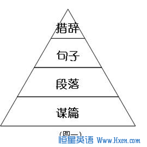 在复习准备四级写作时,我们应该按照“谋篇、段落、句子、措辞”(如图一)“四步走”的宏观复习方式来准备。我们应该将以往的范文作为框架,从谋篇布局着手,加以润色字词句的修饰,将其变成自己的四级高分作文。
