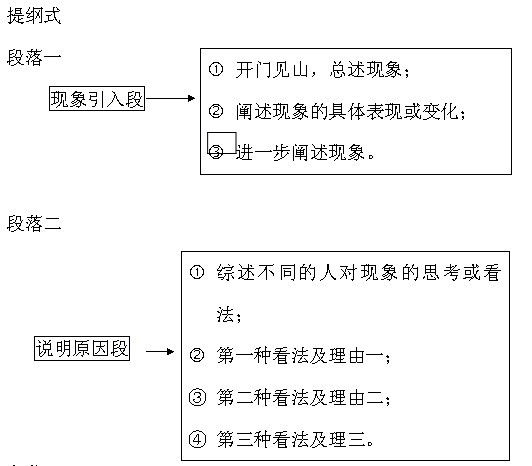 从四六级作文的评分原则与标准中可以看出一篇逻辑清楚的文章是容易得较高的分数的,因此作文的构思很重要,它决定了文章的整体框架。总的来说,三段式的文章结构是比较合理的。《大学英语四六级考试——写作全解读》中详细给出了不同类型文章的写作思路。以现象解释类为例: