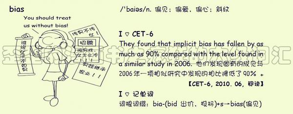【联想记单词】词根词缀:bia-(bid 出价,投标)+s→bias(偏见)