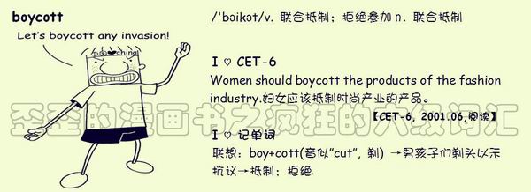 【联想记单词】联想:boy+cott(音似"cut",剃)→男孩子们剃头以示抗议→抵制;拒绝