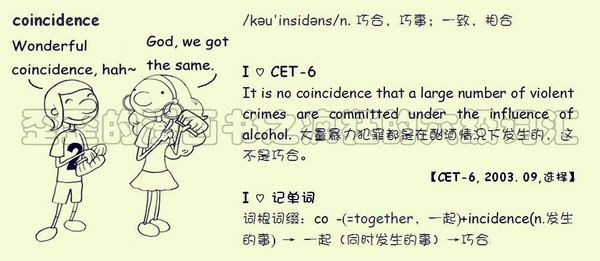 【联想记单词】词根词缀:co -(=together,一起)+incidence(n.发生的事)→ 一起(同时发生的事)→巧合