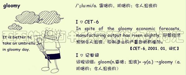 【联想记单词】词根词缀:gloom(n.昏暗;沮丧)+-y(a.)→gloomy (a.阴暗的;令人沮丧的)