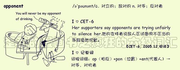 【联想记单词】词根词缀:op(相反)+pon(位置)+ent(代表人)→对手,对抗者