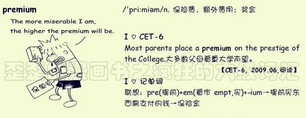 【联想记单词】联想:pre(提前)+em(看作 empt,买)+-ium→提前买东西需支付的钱→保险金