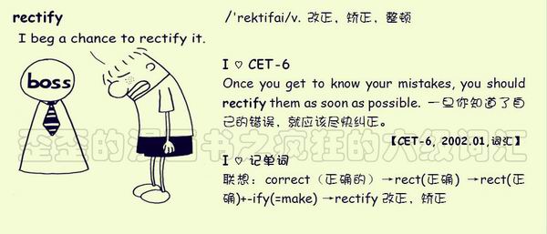 【联想记单词】联想:correct(正确的)→rect(正确)→rect(正确)+-ify(=make)→rectify改正,矫正