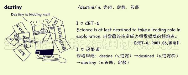 【联想记单词】词根词缀:destine(v.注定)→destined(a.注定的)→destiny(n.天命,定数)
