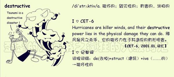 【联想记单词】词根词缀:de(去掉)+struct(建筑)+ive(......的)→破坏性的