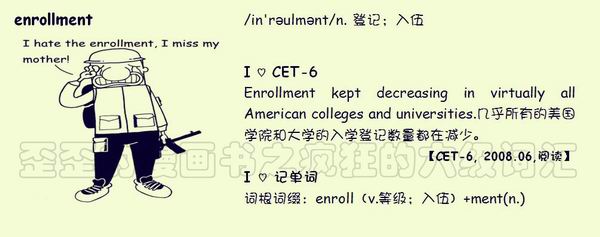 【联想记单词】词根词缀:enroll (v.等级;入伍) +ment(n.)