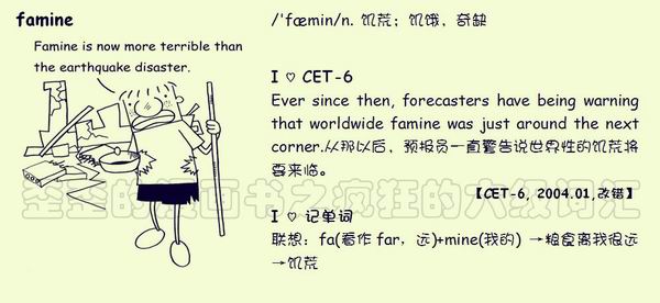 【联想记单词】联想:fa(看作far,远)+mine(我的)→粮食离我很远→饥荒