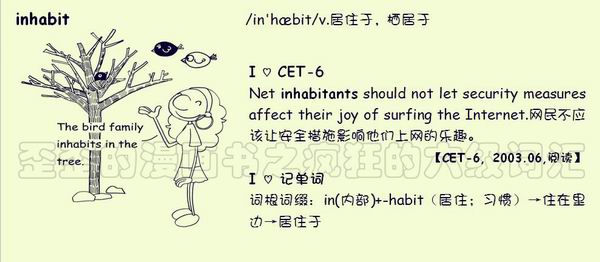 【联想记单词】词根词缀:in(内部)+-habit (居住;习惯)→住在里边→居住于