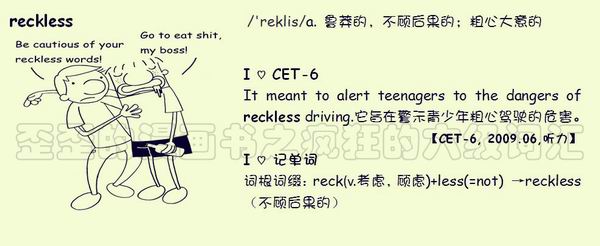 【联想记单词】词根词缀:reck(v.考虑,顾虑)+less(=not)→reckless(不顾后果的)
