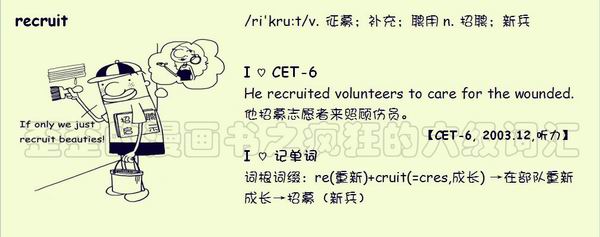 【联想记单词】词根词缀:re(重新)+cruit(=cres,成长)→在部队重新成长→招募(新兵)
