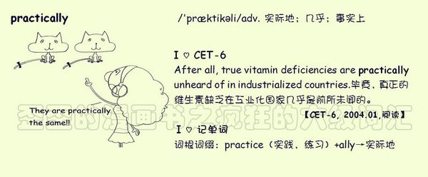 【联想记单词】词根词缀:practice(实践,练习)+ally→实际地