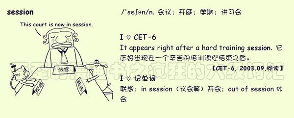 【联想记单词】联想:in session (议会等)开会;out of session 休会