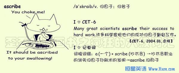 【联想记单词】词根词缀:a(一个)+scribe(抄书员)→抄书员职业的消失归因于印刷术的发明→ascribe 归因于