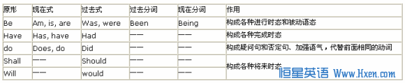 汉语中只有助词,而没有助动词。这又是英汉两种语言的一大差别。英语的助动词,就是起辅助作用的动词,本身没有独立的词义,不能单独做谓语,在句子中只起语法作用,和实意动词一起构成谓语(叫复合谓语),表达否定,疑问,时态,语态和其他语法关系。其基本形式和作用如下表:
