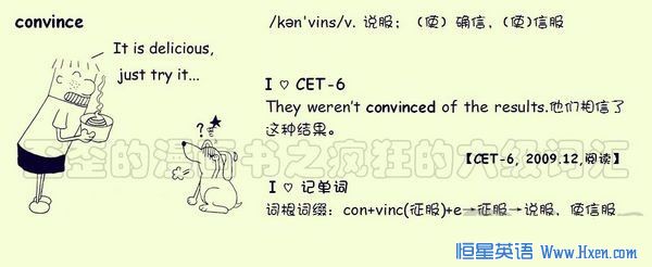 【联想记单词】词根词缀:con+vince(征服)+e→征服→说服,使信服