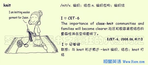 【联想记单词】联想:与knot形近意近→knit 编织,结合;knot 打结