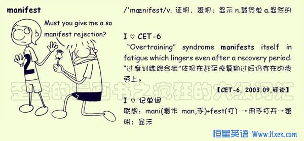 【联想记单词】联想:mani(看作man,手)+fest(打)→用手打开→表明;显示