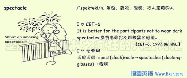 spectacle n.景象,奇观;眼镜;引人羡慕的人