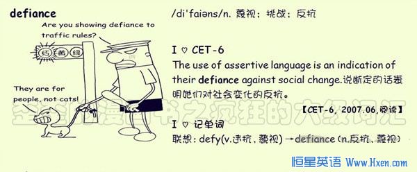 【联想记单词】联想:defy(v.违抗,藐视)→defiance(n.反抗,藐视)