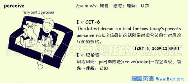 【联想记单词】词根词缀:per(彻底地)+ceive(=take)→完全接受,领会→理解;认知