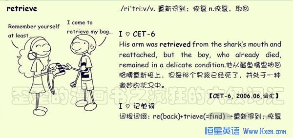 【联想记单词】词根词缀:re(back)+trieve(=find)→重新得到;恢复