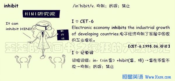 【联想记单词】词根词缀:in-(=in里)+hibit(拿,持)→拿在手里不放→抑制;妨碍;禁止