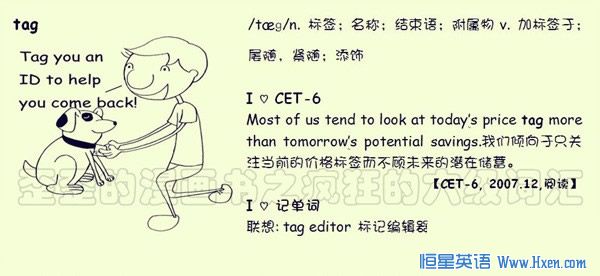 tag n.标签;名称;结束语;附属物 v.加标签于;尾随,紧随;添饰