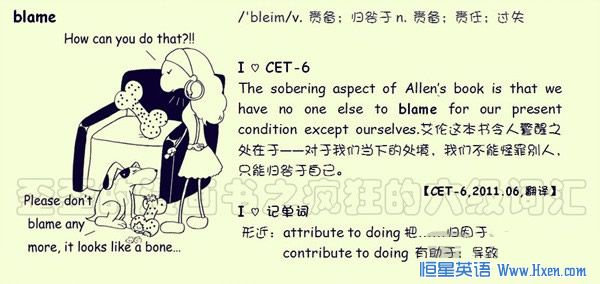 blame v.责备;归咎于 n.责备;责任;过失