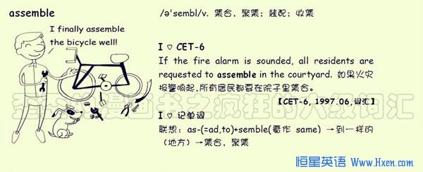 【联想记单词】联想:as-(=ad,to)+semble(看作same)→到一样的(地方)→集合,聚集