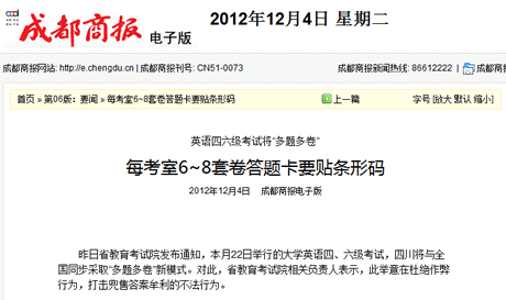 前几天,江苏、江西、四川等地相继确认2012年12月英语四级六级考试将采取“多题多卷”形式。近日,四川省教育考试院再次确认此消息,并补充说明每个考场将有6——8套试卷。以下为消息全文。
