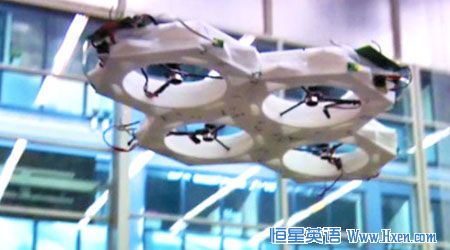 Recently, researchers at the Swiss Federal Institute of Technology's Institute have developped a robotic platform consisting of multiple single-propeller machines that autonomously dock with each other and take flight. Each vehicle is simply designed with wheels for ground motion, one propeller, a computer and infrared sensors that measure the flight angle. They join at random through magnetic links and drive around together.