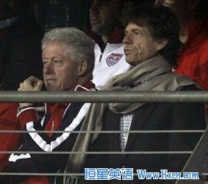 在世界杯八分之一美国队对加纳队的比赛看台后,(小编发现,场内的明星固然大牌,场外观看比赛的明星来头也不小,)原美国前总统克林顿以及滚石乐队主唱Mick Jagger(米克·贾格尔)也加入了这一场“豪门盛宴”。拥有了“钻石级”观众的美国队并未能如愿以偿进军8强,最终还是以1—2的比分败给了非洲之星加纳队。