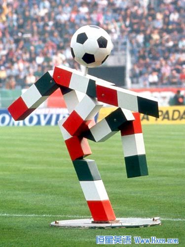 1990年意大利之夏,设计师一反传统,用足球和积木拼成一个人形(中文名“查奥”),它以足球为头颅,以90块由绿、白、红三色(意大利国旗色)积木组成的身躯和四肢,辅以意大利国旗的绿、白、红三色,十分动感而又富有创意。