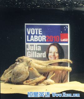 世界杯期间“章鱼保罗”八猜八中的骄人成绩使得世界各地涌现了不少章鱼的粉丝,各国都涌现了用章鱼来预测重大事件的热潮。近日,澳大利亚女总理刚刚宣布要参加8月的大选,便有媒体推出了名为“卡珊德拉”的神奇“章鱼妹”来预测大选结果,称杰拉德将获胜。当地媒体报道说,“章鱼妹”很看好新近上台的工党美女领袖杰拉德,在预测时用她长长的手臂抱住了杰拉德的照片。吉拉德上月取代陆克文出任工党领袖和总理。她上台后致力修正陆克文的不受欢迎政策,令工党支持率回升。