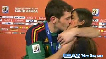 刚获得南非世界杯最佳门将称号的西班牙守门员卡西利亚斯(Iker Casillas)在接受电视台女友 Sara Carbonero 访问的时候给女友深情一吻。