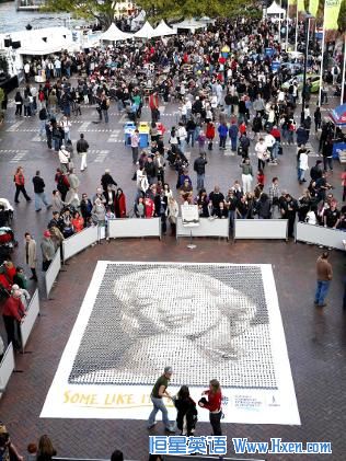 这幅用杯子拼出“梦露”图长6.5米,宽5.5米,有望打破吉尼斯世界纪录。