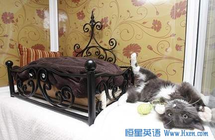 对于外出度假时不知该如何安置自家宠物猫这个问题,英国人最近找到了答案。在英国的赫特福德郡韦林加登城,一对夫妇开了家豪华宠物猫宾馆,专门为猫咪提供服务。这家宾馆共有6间客房,每间客房的装修风格都不同。宾馆的房费为每晚15英镑至19英镑。入住的猫咪可以享受宾馆提供的每日菜谱,也可以单独定制,不过单独定制的餐费要另外收取。宾馆房间里播放着轻柔的爵士或古典乐,而且乐曲会不断变化,以免“客人”生厌。此外,猫咪还可以享受修甲、按摩和日光浴等服务。宾馆的主人24小时全天候伺候这些贵宾,还会时不时给它们拍一些照片,发给它们的主人,以便主人了解自家猫咪的状况。