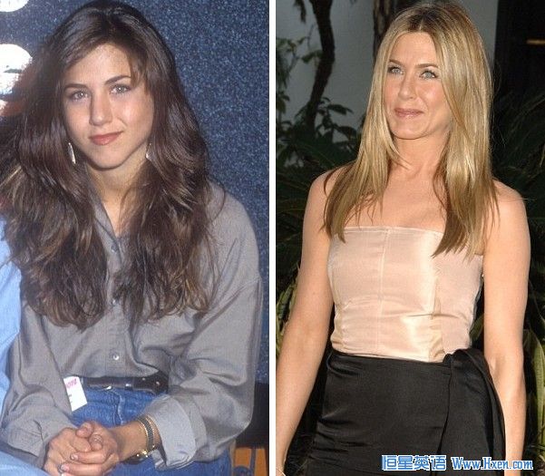 左图:1990年,年仅21岁的珍妮弗·安妮斯顿刚刚成名的时候。 右图:41岁的珍妮弗·安妮斯顿日前在洛杉矶某一电影首映礼上容光焕发地宣传着自己的新电影。看来离婚、无子的“噩运”在这位好莱坞人见人爱的甜姐儿容貌上是看不出一点变化呢。