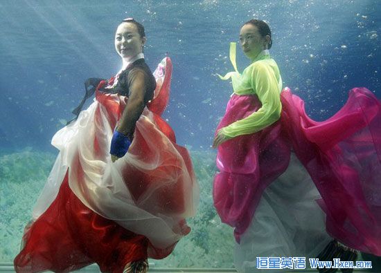 It's not exactly the swimwear we're familiar with. But these Korean dresses looked ravishing at an underwater fashion show in Seoul this weekend.The event, which marked the launch of a new department store, saw the traditional catwalk replaced with a huge tank of water, in which the models performed underwater acrobatics.The vibrant dresses were inspired by traditional Korean hanbok, and were created by local designer Park Sul-Nyeo.
