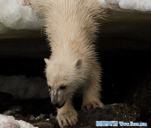 Nearly there: Scrambling down, the cub reaches the whale vertebrae