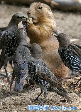 土拨鼠被椋鸟围攻 酣战时不忘啃坚果