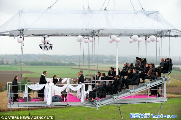 仪式上,新娘、新郎以及神父被巨大的起重机吊在空中——陪伴他们的还有20名宾客,宾客们都被绑在椅子上,只有腿部可以随意摇摆。