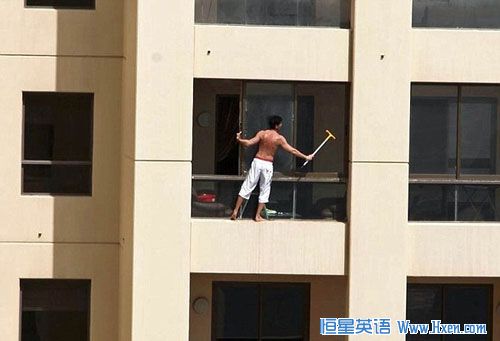资料图:爱干净不要命 摩天大楼窗上擦玻璃