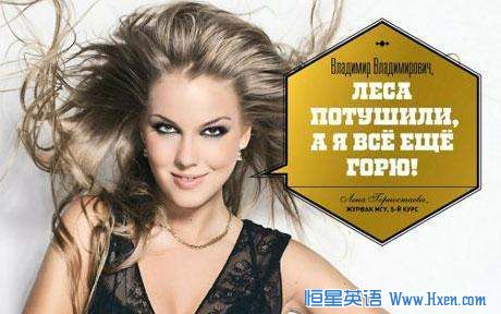 Clad in a black lace negligee, Miss March, Lena Gornostayeva, wishes Putin a happy birthday with the message: "You put out the forest fires, but I'm still burning."