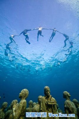 "绿色和平"组织的艺术家们在墨西哥坎昆一个水下博物馆进行表演,警告人们再不采取紧急行动,遏制全球变暖,在沿海地区生活的几百万人们将面临"灭顶之灾"。"绿色和平"组织是一个非政府环境保护组织,它的目标是"确保地球有孕育生命多样性的能力"。