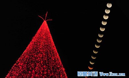 A composite image shows a partial lunar eclipse at dusk over Qingdao, Shandong Province on December 21.