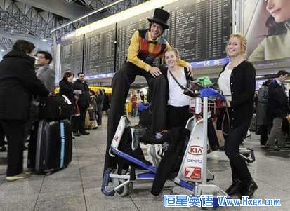 受极端天气影响,欧洲大部分国家本周继续遭遇暴雪,导致多数航班延误或取消,数千乘客滞留机场。为安抚乘客情绪,德国法兰克福国际机场特意请四名小丑到候机大厅表演。这四名小丑身穿颜色鲜艳的演出服,有的还踩着高跷走来走去。据机场发言人称,滞留在机场的很多乘客都带着孩子,对他们来说这样漫长的等待显得更加难熬,于是在会想出请小丑来表演的主意,帮他们打发时间。